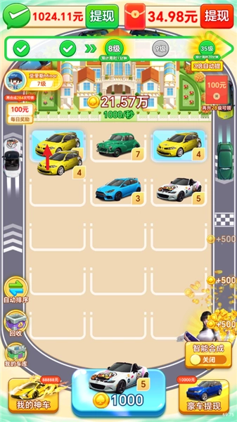 2、每次合成操作都會產出更高級別的豪車,解鎖全新車型時還能獲取紅包獎勵,車輛的等級越高,對應的紅包獎勵就越豐厚!