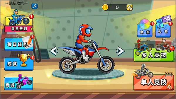 1、把登山極限摩托狂飆安裝完成后,進(jìn)入游戲界面,選擇單人競技模式或者多人競技模式開始游戲。