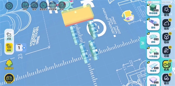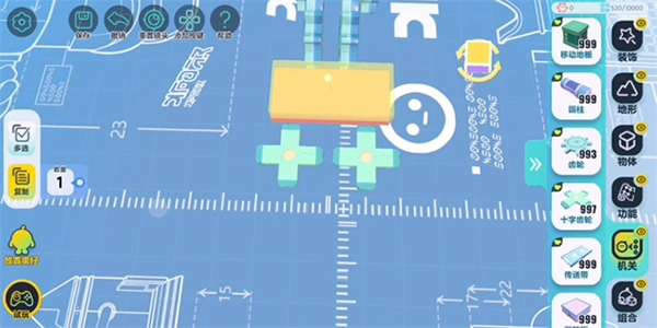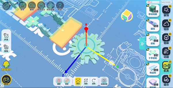 為了操作更便捷,在正式著手搭建之前,要把設置里的編輯視角切換成【上帝視角】。在機關分類里找到“齒輪”組件并拖拽出來,就能完成“齒輪”擺放的基礎操作。除了常規的擺放方式外,還能點擊【旋轉】按鈕讓“齒輪”轉為豎立狀態,也可以通過調整【縮放】參數來改變“齒輪”的整體大小以及側面的寬度。等尺寸調整合適后,點擊左側的【復制】按鈕,就能批量復制已經調整好的組件,從而起到節省時間、提升效率的作用。