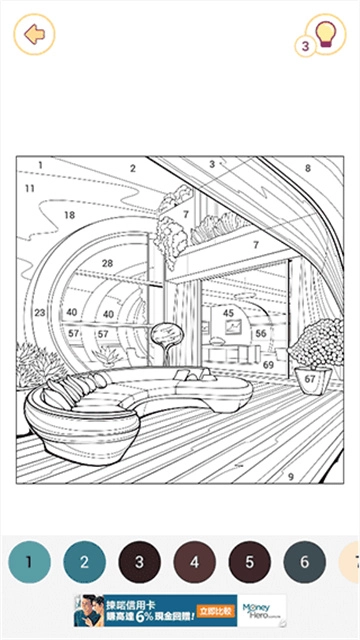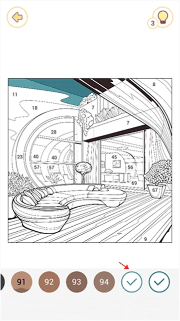 4、如果實在找不到未填完的色塊,除了把圖形放大進(jìn)行尋找之外,還可以點擊右上角的燈泡圖標(biāo),進(jìn)行提示