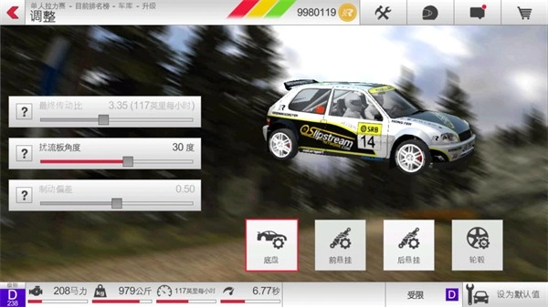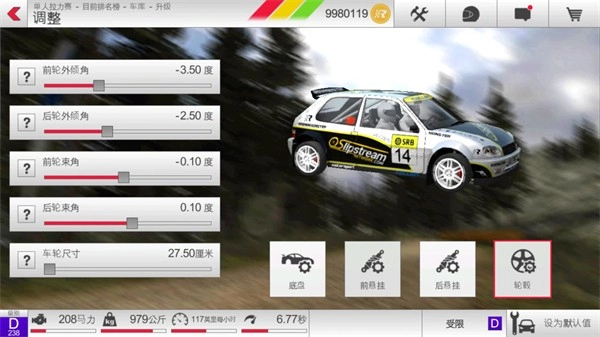 2、懸掛系統:懸掛包含前懸掛與后懸掛,二者可調節的屬性一致。提升車身高度有助于增加彈簧的工作行程,在車輛彈跳顛簸時能降低翻車風險。若前車身升高而后車身降低,車輛容易出現轉向不足的傾向;反之,前車身降低而后車身升高,則可能導致轉向過度。前懸掛彈簧剛度低于后懸掛時,車輛的加速度會有所提升;彈簧剛度數值較大時,懸掛會更硬,此時通過連續凹凸路面會比較吃力,因為車輛容易彈跳,但抓地力會增強;數值較小時,懸掛更軟,通過凹凸路面更輕松,但抓地力會下降,過彎時建議配合手剎操作。防傾桿的作用可類比車輛配重比,它能抑制車輛轉彎時的側滑現象:當前懸掛防傾桿數值高、后懸掛數值低時,車輛易發生甩尾;當前懸掛數值低、后懸掛數值高時,則更容易實現漂移。