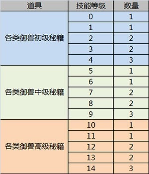 學習寶貝的御獸技能需要消耗一定量的秘籍,御獸技能等級最高為15級。各類御獸技能所消耗的物品和數量如表所示:
