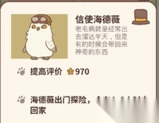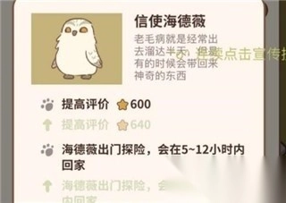 通過種花許愿得到的物品放進海德威的行李箱,它飛行回來時可能會帶回信件、水壺或者星星;就算行李箱是空的,海德威飛行一趟也有機會獲得小魚干和星星。記得多給海德威升級屬性,這樣能縮短它的飛行時間,等升到滿級后,它大概4到8小時就能返回啦。