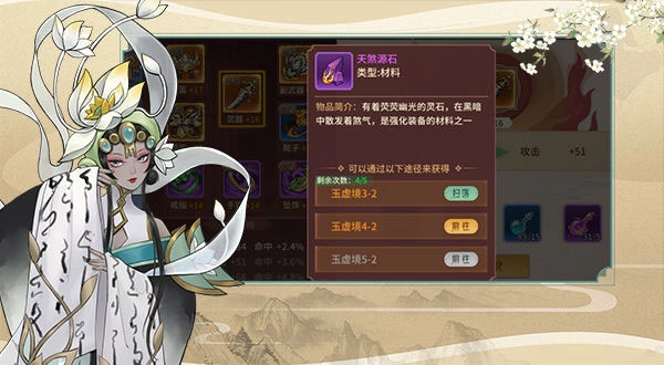 在我們的玉虛鏡秘境之中呢,一共分有9個章節,每個章節內又分有6個小關卡。其中分別擁有著不同等級所需要的不同的裝備強化材料。有荒古遠郊,有頹敗花園,有蒼莽沙穴,有幽暗獸巢……每次通關后大家除了會獲得大量的人物經驗,最重要的便是可以獲取到對應秘境等級的裝備強化材料