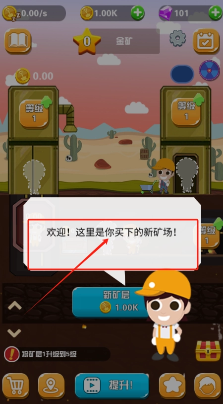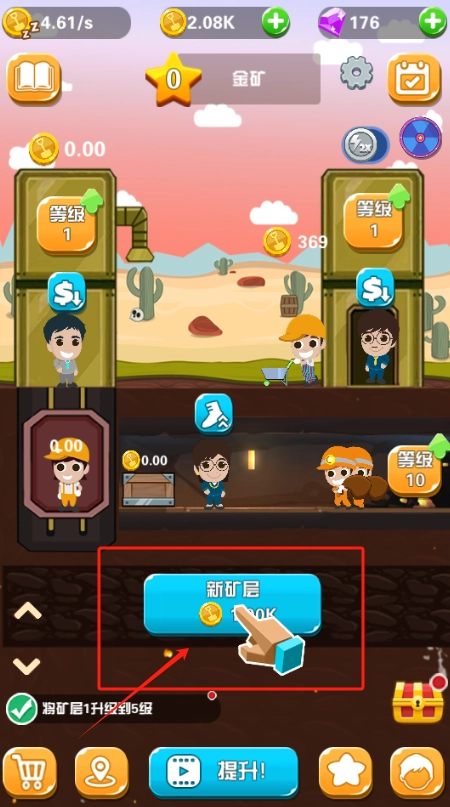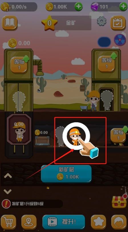 1. 點擊藍色的新礦層按鈕,消耗1.00K金幣購置新礦,按照任務指引把礦層從1級提升到5級。