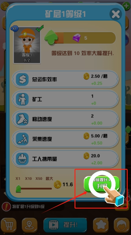 3、點擊綠色的升級按鈕,花費11.6金幣來提升礦層1的屬性,建議優先增加采集速度。