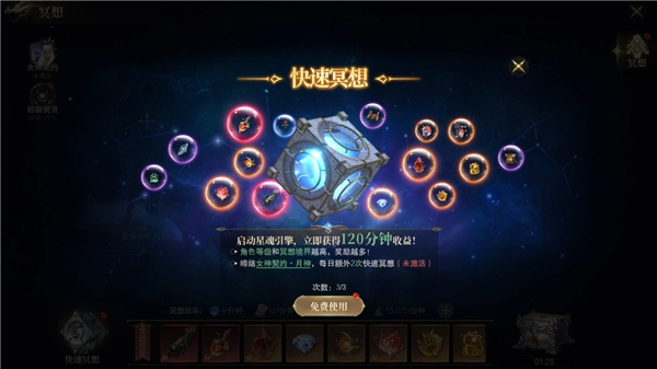 一鍵冥想,120分鐘收益馬上到賬!小技巧1:提升角色等級和冥想神器境界,讓每次冥想都更劃算!小技巧2:和月神女神簽訂契約,每天額外獲得兩次快速冥想機會,經驗不用等!