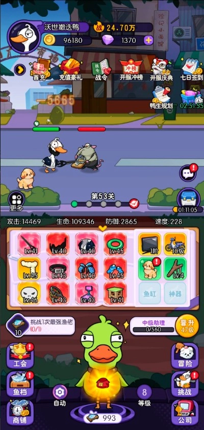 核心玩法以養(yǎng)鴨為核心:初始擁有一只鴨,投喂過程如同開啟盲盒,大量裝備、金幣和經(jīng)驗?zāi)茌p松獲取;品質(zhì)優(yōu)良的裝備可直接穿戴以提升戰(zhàn)斗力,而那些“鴨肋”裝備則可果斷出售兌換資源,成為精明的鴨老板。除此之外,還有伙伴、神器、玩具等多維度的養(yǎng)成系統(tǒng),通過布置魚缸合成奇特魚類來獲得屬性加成,同時解鎖“武林漁夫”的趣味玩法。