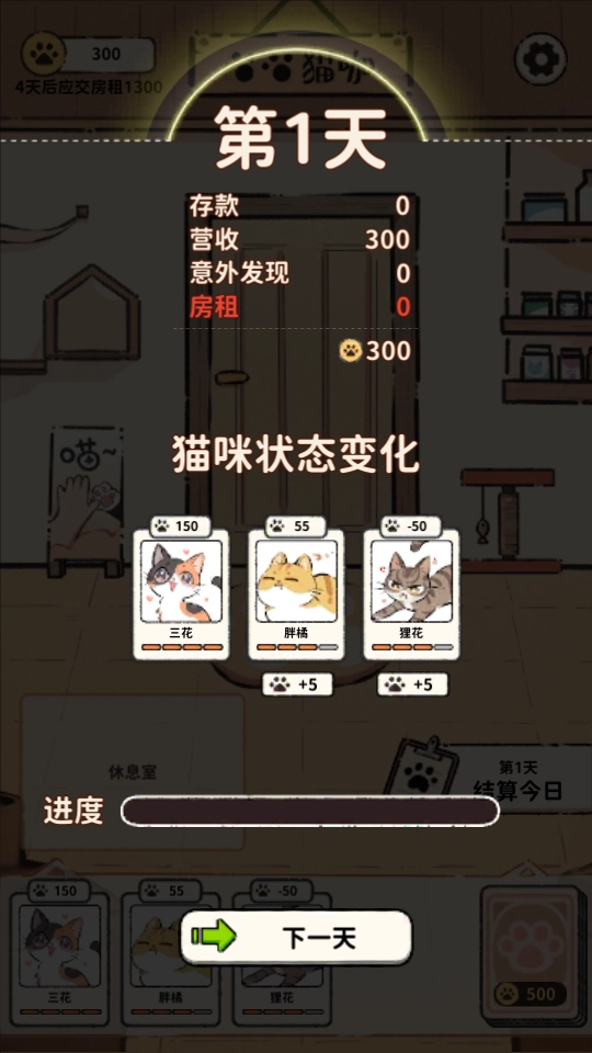 開局需要額外注意貓貓精力,不要讓所以貓同時精力不足,要保證下一局夠三只貓的前提下多上貓,如果實在不能保證,即使空房間也不要讓貓疲憊,很耽誤后面賺錢(除非就差一點點夠第五天房租)。