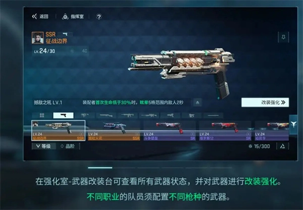 6、不同職業(yè)的隊(duì)員,只能裝備對(duì)應(yīng)職業(yè)的武器。在【強(qiáng)化室-武器改裝臺(tái)】可查看所有武器狀態(tài),并對(duì)武器進(jìn)行改裝強(qiáng)化。