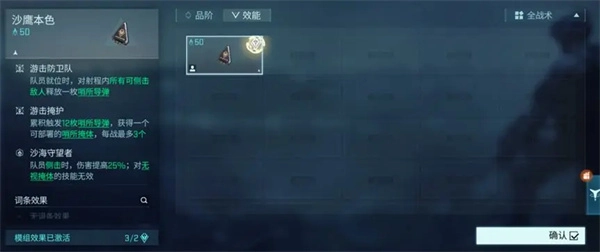 7、等級(jí)到達(dá)25/35級(jí),分別可獲得一塊沙鷹本色和一塊自選戰(zhàn)術(shù)模組。每位隊(duì)員至少擅長(zhǎng)兩種戰(zhàn)術(shù)。如果編隊(duì)中擅長(zhǎng)某種戰(zhàn)術(shù)的隊(duì)員達(dá)到一定數(shù)量,就能激活對(duì)應(yīng)的戰(zhàn)術(shù)模組,獲得強(qiáng)力效果。比如【沙鷹本色】模組,就能讓隊(duì)員入場(chǎng)時(shí),對(duì)射程范圍內(nèi)所有可側(cè)擊敵人釋放一枚導(dǎo)彈。