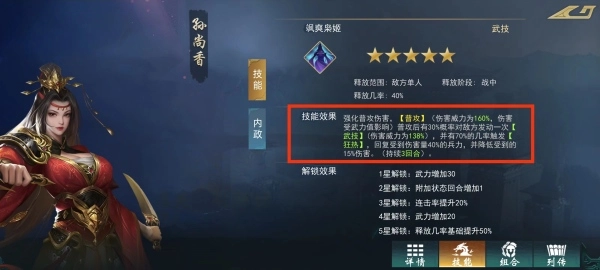主技能:分為武技、計謀、鼓舞技三類,一般為戰(zhàn)斗中釋放。技能的釋放幾率和技能效果都會隨著升紅后的解鎖效果得到強化。