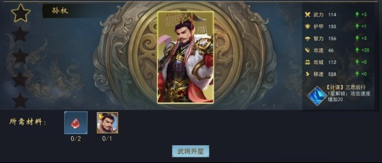 在游戲中,武將升星能提升武技技能和屬性,但需要消耗陣營符石和相同武將碎片。武將的星級決定了武將的上限。