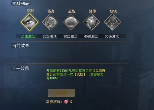 1星武將每升級10級,都能通過消耗武將碎片覺醒一個技能,使用將魂可以提升覺醒技能等級。