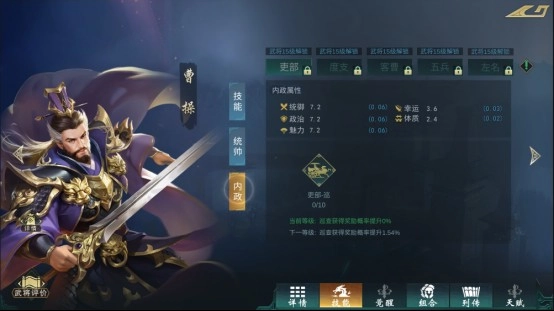 內(nèi)政技能屬于城池內(nèi)政技能,需要在占領(lǐng)名城后,在城池中展開相應(yīng)的內(nèi)政玩法才能產(chǎn)生效果。不過開啟內(nèi)政需要到達(dá)一定等級和武將碎片進(jìn)行解鎖,解鎖后可以通過“符石”進(jìn)行升級效果。