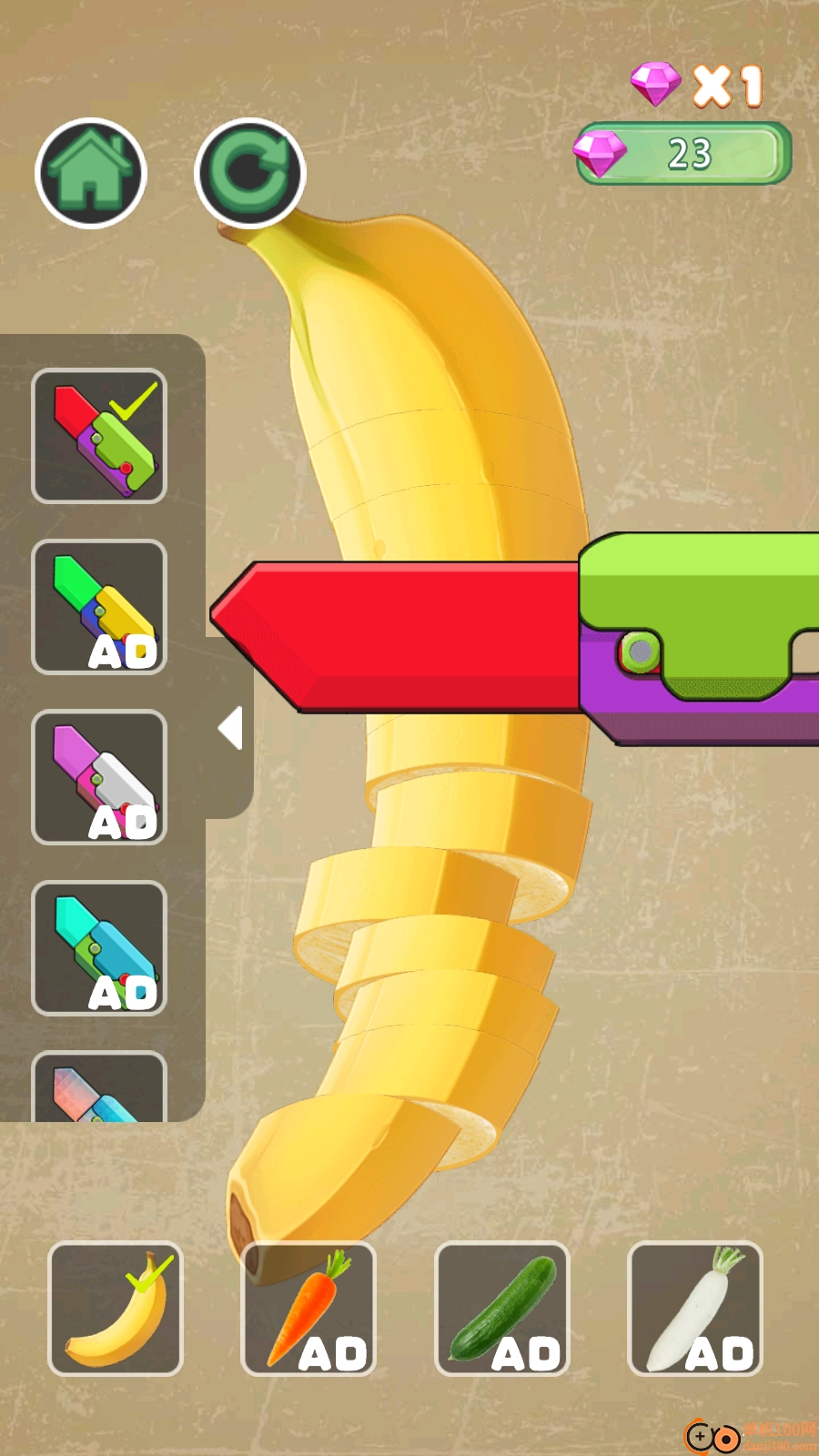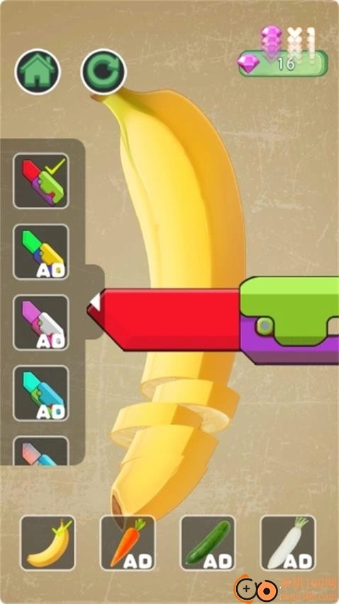 5、切水果的玩法,可以在游戲底部解鎖香蕉、胡蘿卜、黃瓜、白蘿卜