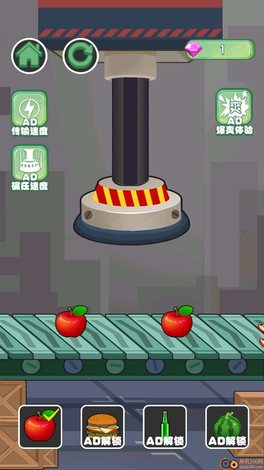 3、關卡玩法很簡單,可以自動顯示液壓機碾壓蘋果的玩法,您也可以在游戲解鎖漢堡,解鎖瓶子