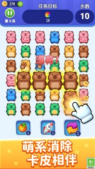 可愛的卡皮巴拉等動物形象正等待你來匹配消除。在關卡里,你可以通過交換元素湊成同色連線,在有限步數(shù)內(nèi)達成目標,開啟一段治愈又燒腦的消除冒險之旅。