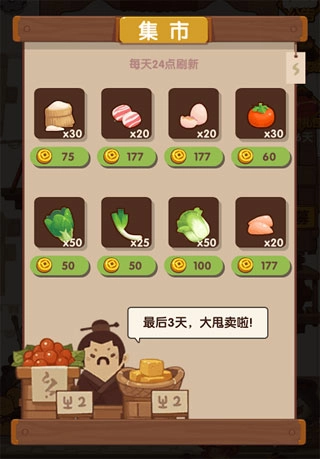 初始集市不解鎖,隨著主線任務再慢慢解鎖,隨著客人越來越多,客棧越來越紅火,有些食材是需要在集市上去購買的,這時候你就可以用客棧掙得的金幣在集市上購買需要的食材,滿足客人的需求,同時還能獲取更豐富的獎勵哦!