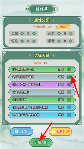 1、在屬性分配界面,先將可分配點數按需分配到靈根、悟性等屬性上,再選擇天賦,選好后點擊開始人生按鈕,開啟游戲修行流程。