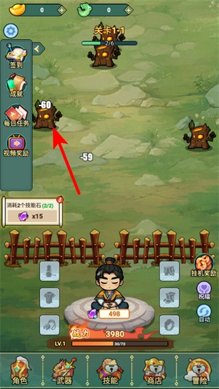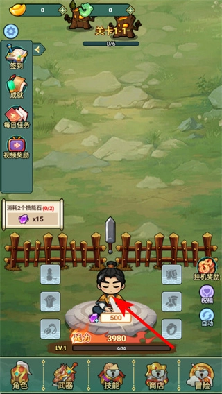 2、進入關卡后,點擊角色旁的修煉按鈕消耗資源提升戰力,同時可通過左側功能欄查看簽到、成就等福利,積累資源強化自身。