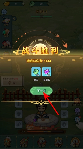 4、戰斗勝利后,領取對應的獎勵道具,然后點擊下一關按鈕進入新的關卡挑戰,持續積累資源與提升戰力,逐步推進游戲的關卡進度。