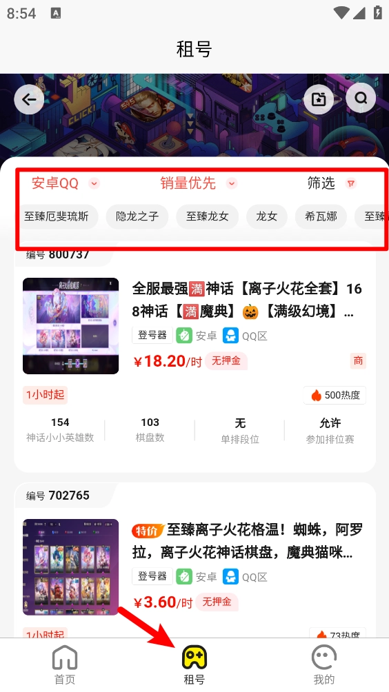 3、還可以切換至"租號"板塊進行篩選。