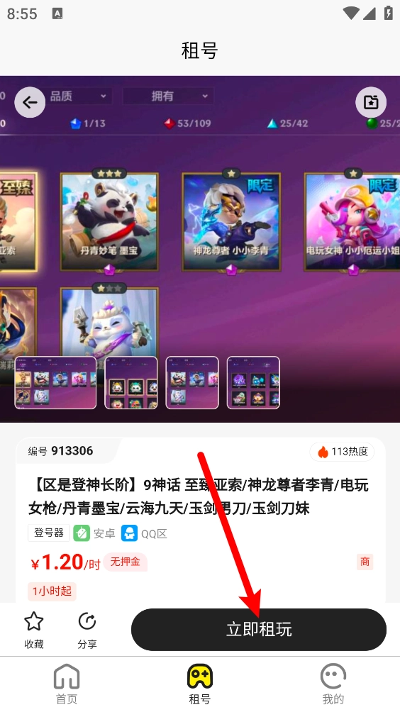 4、選擇所需商品點擊進入,在詳情頁可以查看賬號的信息,點擊"立即租玩"。
