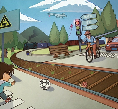 2、男孩穿著藍衣服,書里夾著一本漫畫書,點擊漫畫書就可以了。