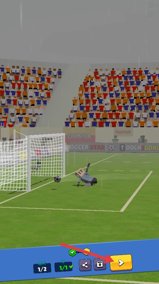 4、進球獲勝后,點擊右下角黃色箭頭按鈕,繼續進行下一場比賽。