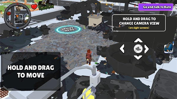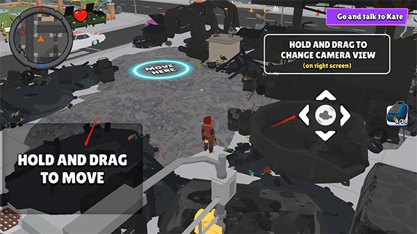 1、打開(kāi)游戲使用左側(cè)虛擬搖桿控制移動(dòng),右側(cè)按鈕調(diào)整視角方向。