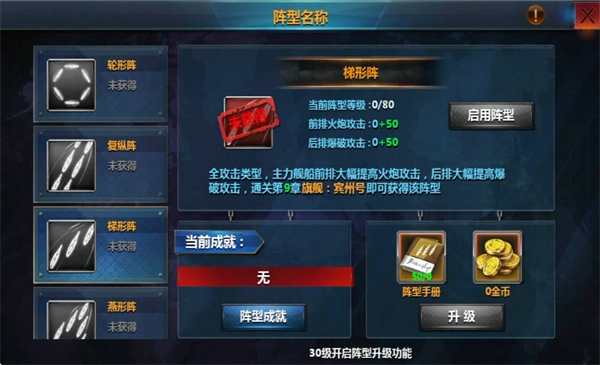 每個陣型擁有不同的屬性加成,玩家可以選擇開啟其中的任一陣型,開啟后則為所有艦船增加對應(yīng)的陣型屬性。
