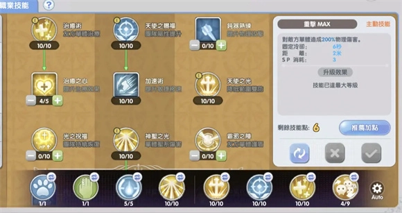 1、一轉技能里,天使之賜福、加速術、治愈術、天使之障壁是必點技能,剩下的5點技能點可以選點霸邪之陣。因為霸邪之陣和二轉進階技能圣母之祈福的效果會相互覆蓋,后期通常會選效果更優的圣母之祈福,所以霸邪之陣不用點滿;不過在還沒進階二轉的時候,它在PvP場里還是挺好用的。瞬間移動雖然能用蒼蠅翅膀代替,但如果有參與PvP的習慣,也可以酌情學一下,具體看個人選擇。