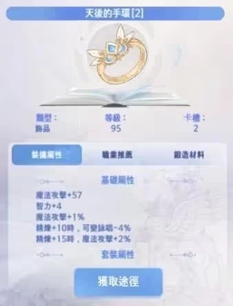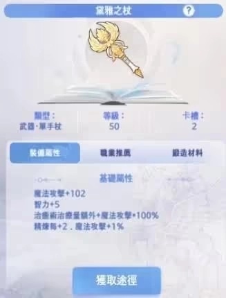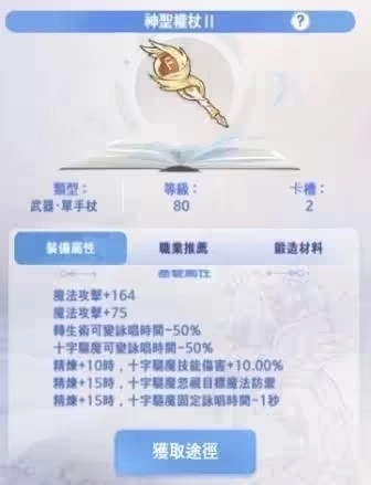 2、贊美:武器:黛雅之杖,黛雅之杖本身有加魔攻,以結果來看補量反而比紅十字多,為神官首選。衣服:樂園團套裝、生命樹之靴,套裝有無屬性減傷,鞋子有治療加成,增加坦度及補血量。盾牌:免疫者之盾,飾品:挑選有加魔攻的即可,初期飾品差異性不大。