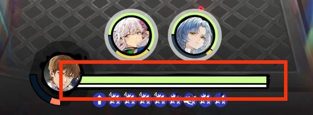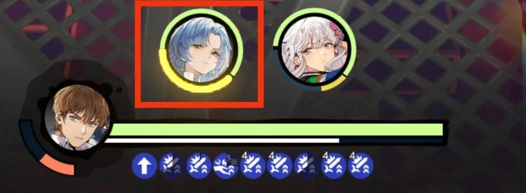 3、待選角色上方的綠色條代表血量,下方的黃色條則是其奧義(大招)的怒氣值。當該角色的奧義怒氣值蓄滿時會出現閃爍提示,不過此時切換到該角色并不會自動釋放奧義,需要手動點擊右側的奧義圖標來觸發。