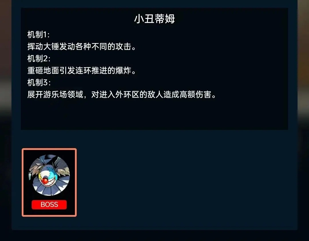 2、在血量降低到三格及以下時,小丑會跳到場地中心使用無敵金身進行蓄力,一段時間后落下造成一段傷害,然后生成一個持續一段時間的領域,在領域外圍會收到持續性傷害。并在此后小丑會有一個無敵旋風錘的技能,并且之后使用的跳擊、左右橫掃、滾擊都會得到強化:技能多釋放一段。