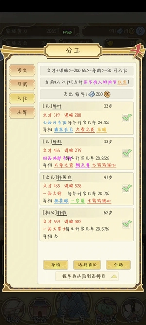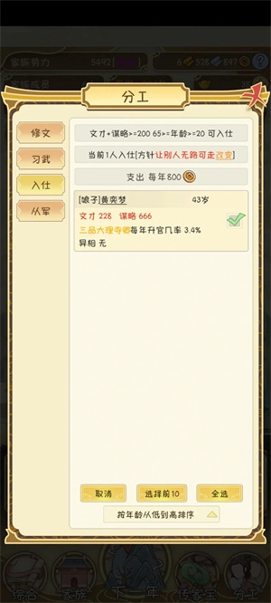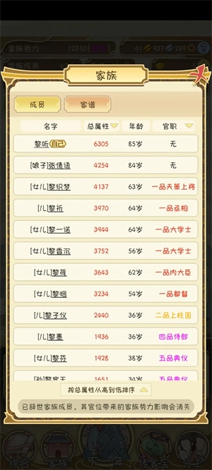6、關(guān)于官員晉升的途徑:在發(fā)展前期,職位提升的速度通常較慢,不必過(guò)于關(guān)注;當(dāng)家族成為望族后,晉升主要依賴于參加大會(huì)。需要注意的是,若后代已是一品官員,則無(wú)需參與這類大會(huì)——因?yàn)橐话銋⒓觾纱未髸?huì)就必然能獲得一次晉升機(jī)會(huì),建議將這樣的晉升機(jī)會(huì)讓給其他族人。家族中擔(dān)任高官的成員越多,自然能帶來(lái)更高的收入和更強(qiáng)的勢(shì)力。