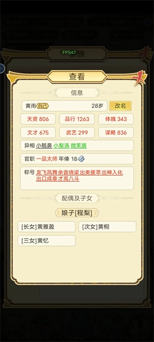 5、關(guān)于子女的婚嫁安排:為兒子(若隨母姓則為女兒)挑選配偶時(shí),應(yīng)優(yōu)先選擇最優(yōu)的對(duì)象。這需要結(jié)合孩子自身的屬性來(lái)考量——如果孩子天資與品行出眾,就值得重點(diǎn)培養(yǎng),在配偶選擇上也需更用心;至于女兒、外孫等,配偶選擇可以相對(duì)寬松,最低標(biāo)準(zhǔn)是選擇本府出身的,因?yàn)楸靖錾碚呖芍苯尤胧藶楣伲鴮傩缘拖抡咧荒軠S為無(wú)作為的閑人。婚禮規(guī)格建議選擇5元寶20勢(shì)力的,這是性價(jià)比最高的;若元寶不足,也可以選擇免費(fèi)結(jié)婚,但不建議選擇20元寶的規(guī)格,除非是為你自己或欽定的候選人舉辦婚禮。