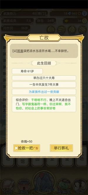 玩著玩著竟然掉眼淚了,就玩了一局,差不多六個(gè)小時(shí)。年紀(jì)越大,好多事都開(kāi)始覺(jué)得力不從心——一開(kāi)始連一些游戲設(shè)定都摸不透,比如那些孩子,沒(méi)及時(shí)安排他們修文習(xí)武、入仕從軍。玩到后面,我硬撐著多活了幾次,可最終還是得“撒手人寰”。大女兒繼承了家業(yè),因?yàn)槲以谟螒蚶镉玫氖恰柏边@個(gè)名字,所以直系后代全是“攸xx”的格式,代入感特別強(qiáng)。越往后我越焦灼,瘋狂看廣告攢元寶,刷宗祠的好屬性,請(qǐng)最好的媒人、教書(shū)先生、養(yǎng)生師和武師,就怕我“走”了之后,后人守不住這份家業(yè)。從寒門(mén)一步步爬到名門(mén)望族,可我已經(jīng)一百一十多歲,知道大限快到了,就更拼命刷元寶、刷各種增益道具,一個(gè)勁往紅娘館跑,給后輩張羅婚事。 這里面最爭(zhēng)氣的是我女婿羅忌的女兒,我給她取名“羅帝女”——她出生就有異相,各項(xiàng)屬性都拔尖,后來(lái)在仕途上一路做到一品大員,沒(méi)讓我失望。可我孫子就差遠(yuǎn)了,我給他取名“攸天子”,結(jié)果他只混到八品官就停滯不前。因?yàn)槲铱偪磸V告逆天改命,反倒老是“白發(fā)人送黑發(fā)人”。有些沒(méi)印象的族人走了就走了,復(fù)活誰(shuí)我還得看他們的官階和對(duì)家族的貢獻(xiàn),唯獨(dú)一直復(fù)活的是我的結(jié)發(fā)妻子——她綜合屬性比我還高,可……走得還是比我早。 總的來(lái)說(shuō)這游戲可玩性挺高,像我這種喜歡文字游戲又愛(ài)策略養(yǎng)成的,一天看百八十條廣告都不覺(jué)得煩。里面有各種建筑和道具,我就是想把自己的家族打造成一個(gè)真正的龐然大物。