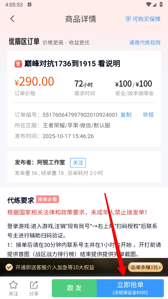 5、既然你商品詳情頁,點擊"立即搶單"即可。