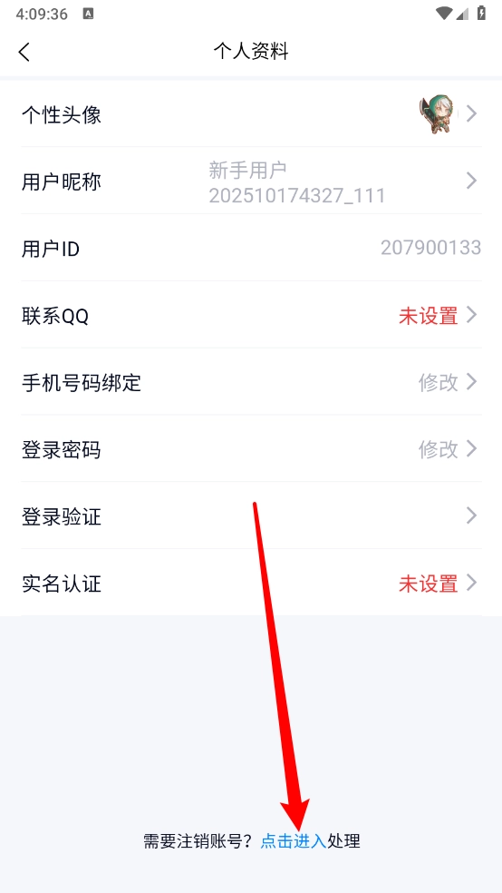 3、然后在個人資料界面點擊底部藍色字體進入,如圖。