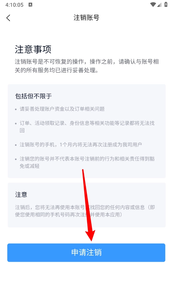 4、最后查看對應的注意事項,點擊"申請注銷",根據提示完成注銷即可。