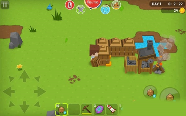 選一個靠近水塘的地方,放置營火與工作臺,工作臺放好后,在“攻擊”按鈕上面就會出現(xiàn)工作臺圖標(biāo),點(diǎn)擊即可打開工作臺。