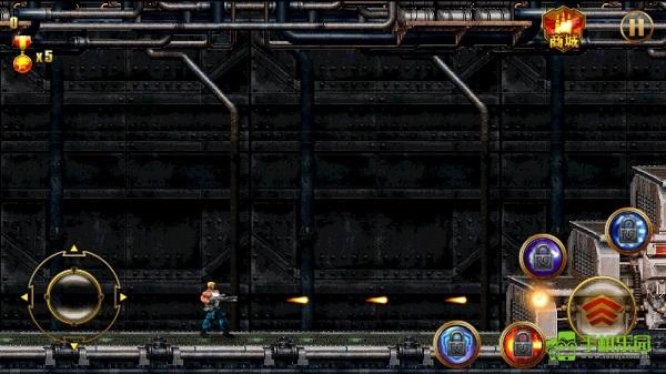 BOSS攻關法:這關的BOSS是從空中出現的一個平臺,它會不斷派出小機器下來撞主角,不過這些小機器可以通過跳的方法躲過也可以在它們掉下來的時候就在空中干掉它們,平臺還會隨時變換位置,不過只要用槍對準它一直開,很快就能過關了。