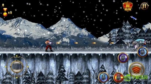 魂斗羅進化革命這關的游戲場景在一片冰天雪地中,這關出現的新兵種--機槍兵(發射子彈的速度奇快),而且這關出現的小兵還會趴下開槍,這無形中增加了游戲的難度,一開始就往前沖,這時雪地里會出現炸彈和機槍兵,在打死機槍兵的同時躲避在身后拋起的炸彈,走到三個斷崖的旁邊,這時要慢慢走,等后面的三個道具飛過來把最好全部打中,都是有用的,一個“S”,一個“R”,還有一個是“神鷹”,這個時候千萬不要向前跳,因為在水里還埋伏著一個向天上放散彈的家伙,等他冒出頭時撿“神鷹”干掉他,如果有散彈可以輕松地干掉他;跳過三個斷崖后,就是兩段平坦的大路了,這兩段平坦的路上各有一輛大坦克,解決方法很簡單:退到屏幕的最左方轉頭,對著坦克一直開槍,當把它打紅時它就會向我們沖過來,不要跑,一直開槍就可以在它沖過來之前把它搞定,搞定兩輛大坦克后,再經過一片有炸彈的雪地就來到了關底。