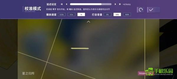 進入校準模式后,會自動播放一段譜面,此譜面隨著延遲設定動態調整時間,玩家需要慢慢調整延遲,使得音樂和譜面對應。