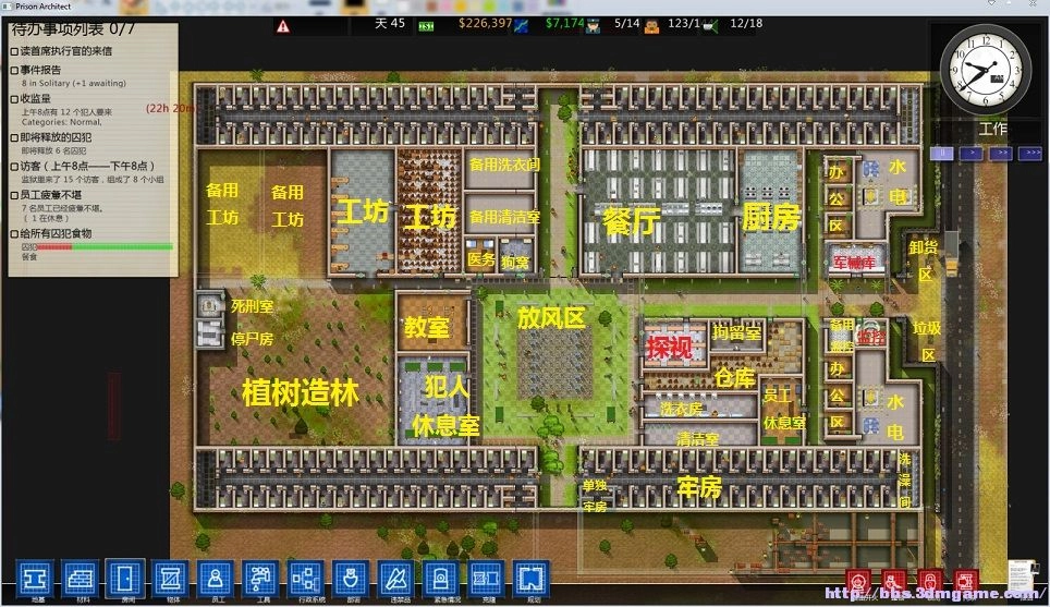 3.整座監獄沒有建成全封閉的院子,沒有建圍墻或圍墻并不嚴密,這樣牢房區在“部署”界面看是閃爍的黃色區塊,犯人是無法行動的。