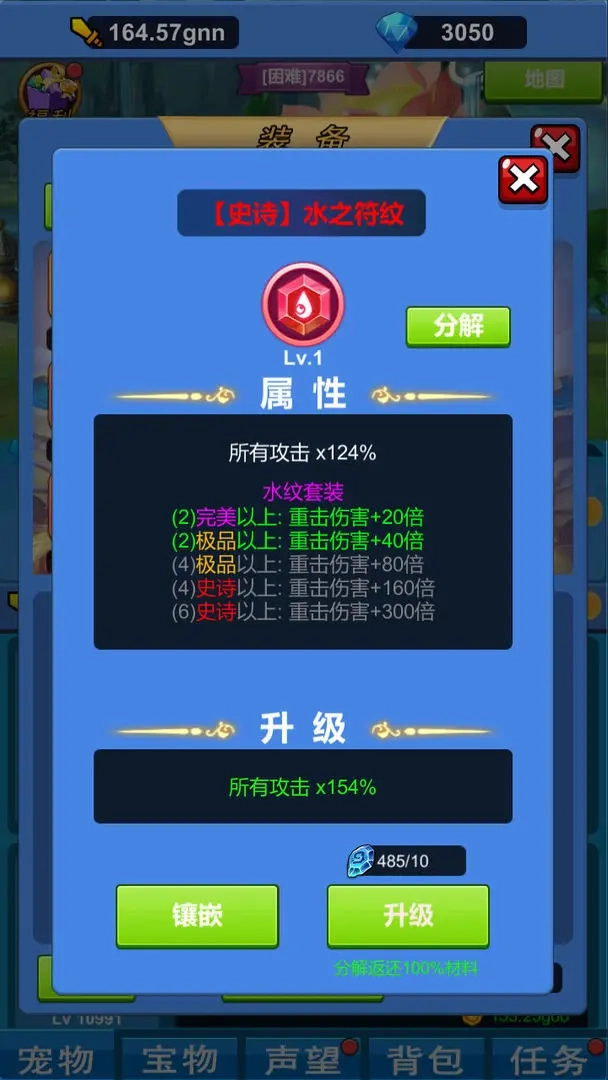 裝備750關解鎖,攻擊力加成。跟寶物一樣,加成全體攻擊力。和寶物一樣,優先強化高品質單個到頂級。目前裝備獲得是抽卡形式,概率一個天一個地,這個是惡心到我的地方,有人一天2紅,有人3天還是一身紫色。強化40級之后,紅色和橙色差距是幾百倍,總攻擊力這就差距幾百倍。一個休閑掛機游戲搞個抽卡我是看不懂,你又不是要開充值,整這個確實沒看懂。雖然說是單機游戲,沒排名什么的,但是這一手操作確實惡心人。