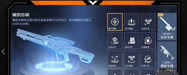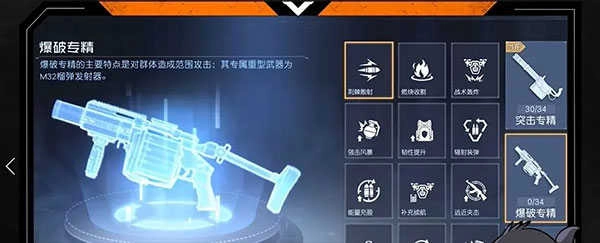 例如,突擊專精對應著M134重型機槍;爆破專精對應著M32榴彈發射器;輔助專精對應著B39生化步槍。