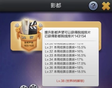 每天開展經典翻拍(后續內容會詳細說明)有助于提高影都聲望,玩家可依據自身所處檔位解鎖相應的影都聲望等級,當前版本的最高檔位為世界10檔,對應的聲望等級是Lv40。若玩家在上一周成功完成了聲望的累計,那么下一周所有影片的拍攝(沒錯,就是所有拍攝的影片,就是這么給力?。┧@得的總票房,都能享受到對應等級所介紹的百分比加成。